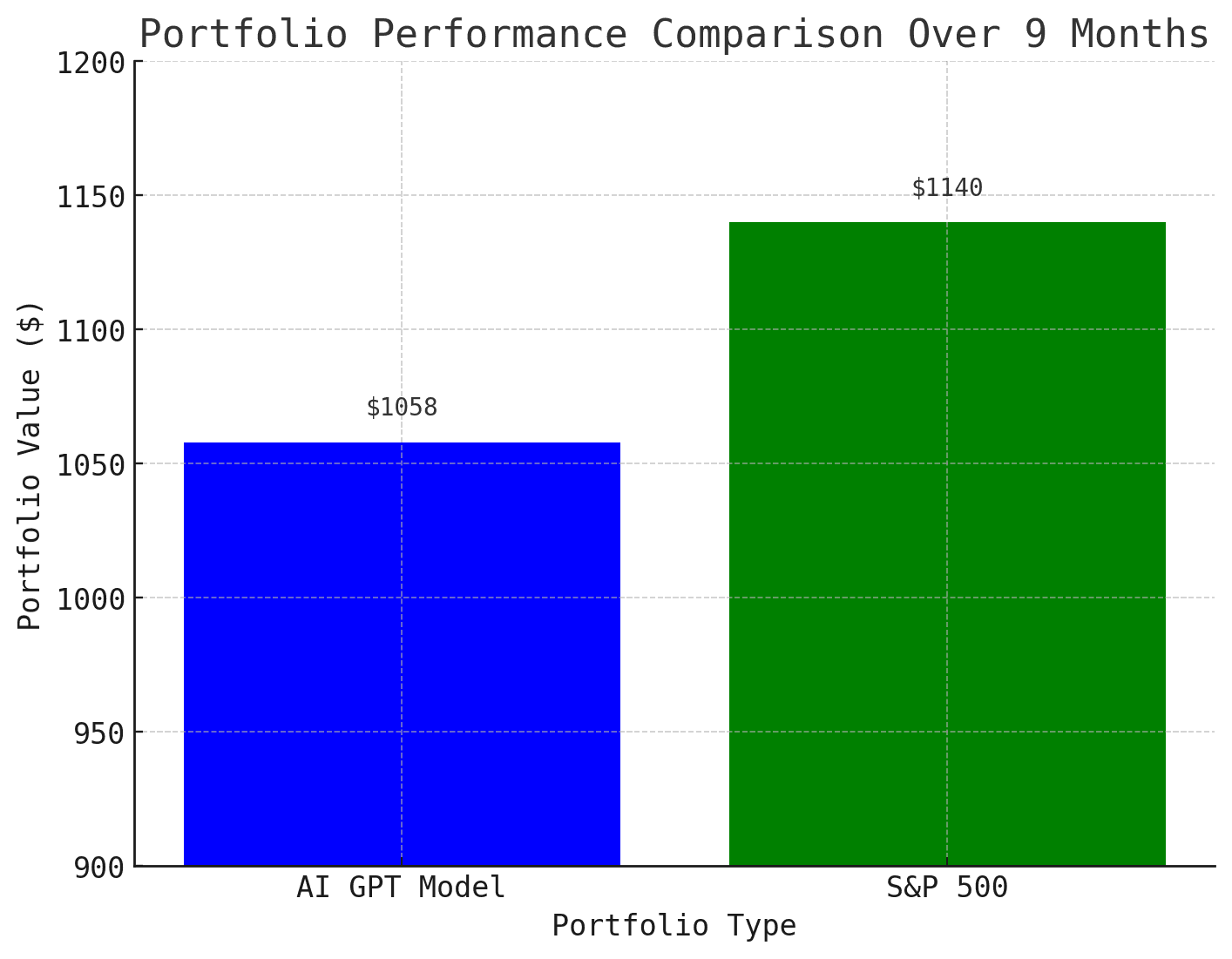 After nine months, GPT made 5.8% return on my investment. While positive, this was notably less impressive than the S&P 500's 14% increase over the same period. Essentially, by not simply investing in the S&P 500 (a basket of the top 500 funds in the market), I missed out on an additional 9% gain.